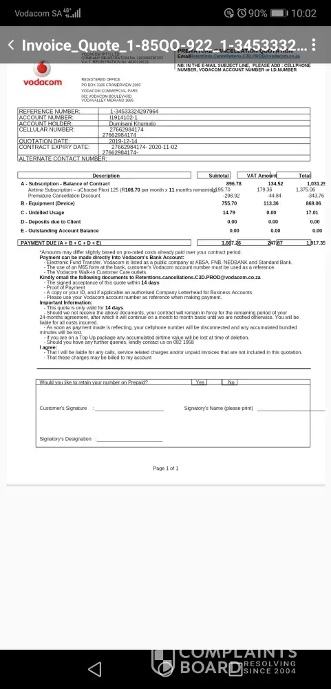 I feel beyond frustrated with the company Vodacom. About a month ago I have contacted them.to switch to paying cash as being under debt review no debit orders can run against my cheque account. I even changed the date of when I will pay as paydate has changed. To my greastst grievance they did not change a thing and debit my account and charged me interest. But it is not all. In November I received a statement thst my balance due is R 504. And thst I had a credit of R 750. On the 3nd of December I went to the ship to pay R510. This payment is not even against my account . Cannot even cancel my cellphobe yo switch to pay as you go and keep my number due to the contract! Contact number [protected].See attached proof where in credit before invoices raised and amount paid