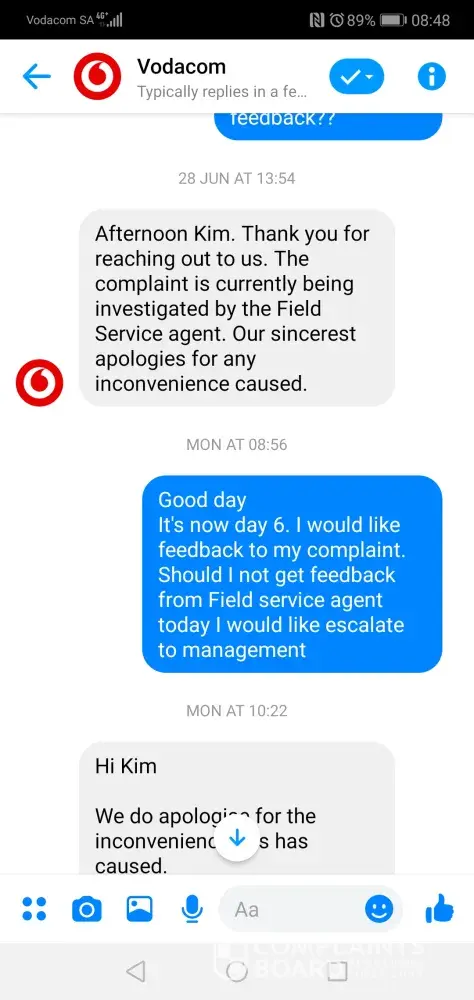 Vodacom I lodged a service report 3 times already with the last month and no one has bothered contacting me.