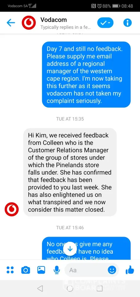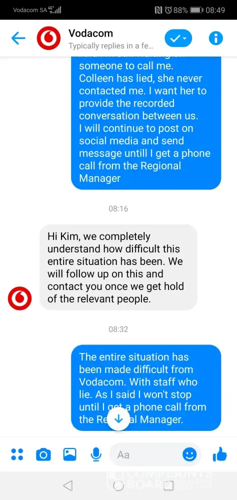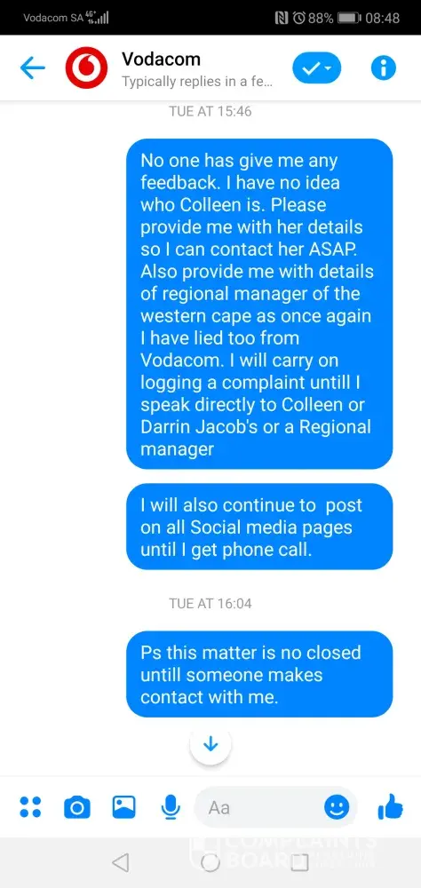 Also your as per your message to me, Colleen your customer relations manager has made no contact with me. This is a complete lie and I want a copy of this recording that she called me. Get the Regional Manager of the Western Cape to make contact with ASAP