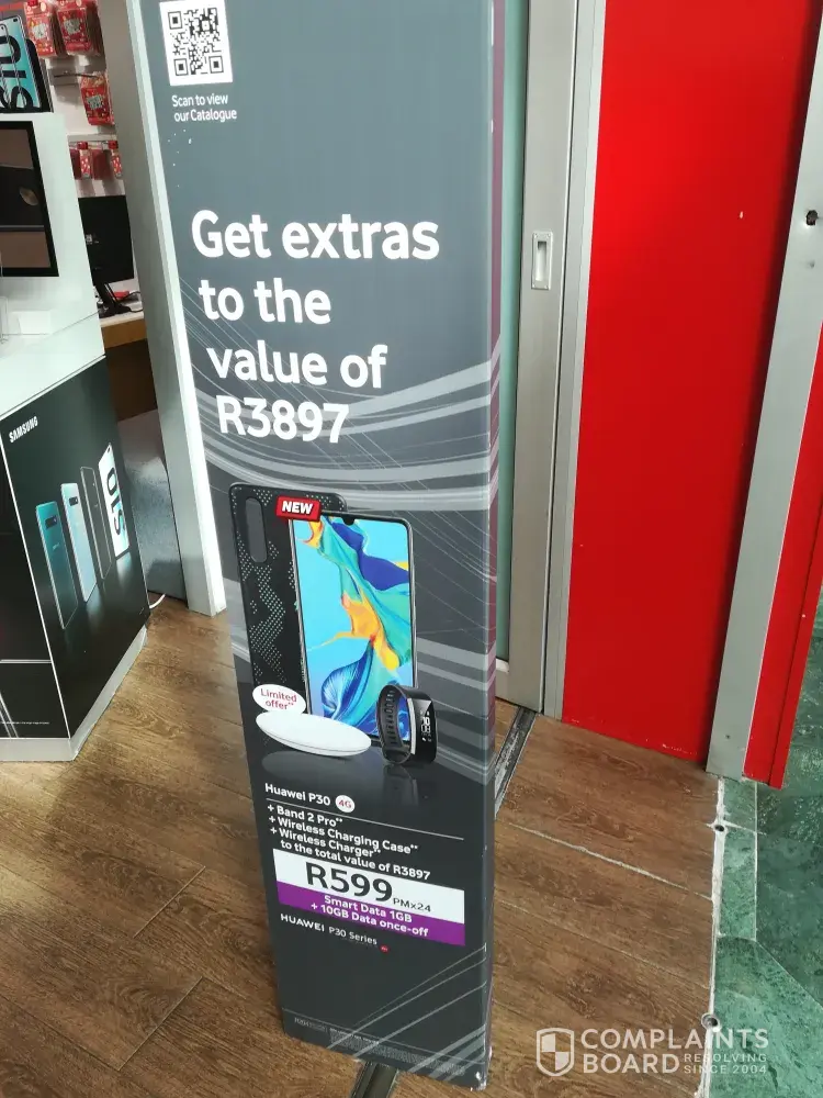 I was discussing phone options with one of the consultants, who on hearing I might be keen on Samsung or the Huawei P30, pointed out the deal that was currently on promo in the store for the Huawei P30. All the advertising boards were up in the store showing the promo. (attached photo of one board I was shown by the consultant to show me all the gifts I would receive with the deal.)