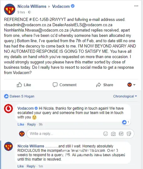Seems Vodacom is quick to sell a contract, quick to send a statement, quick to except money but has no interest in customer care.