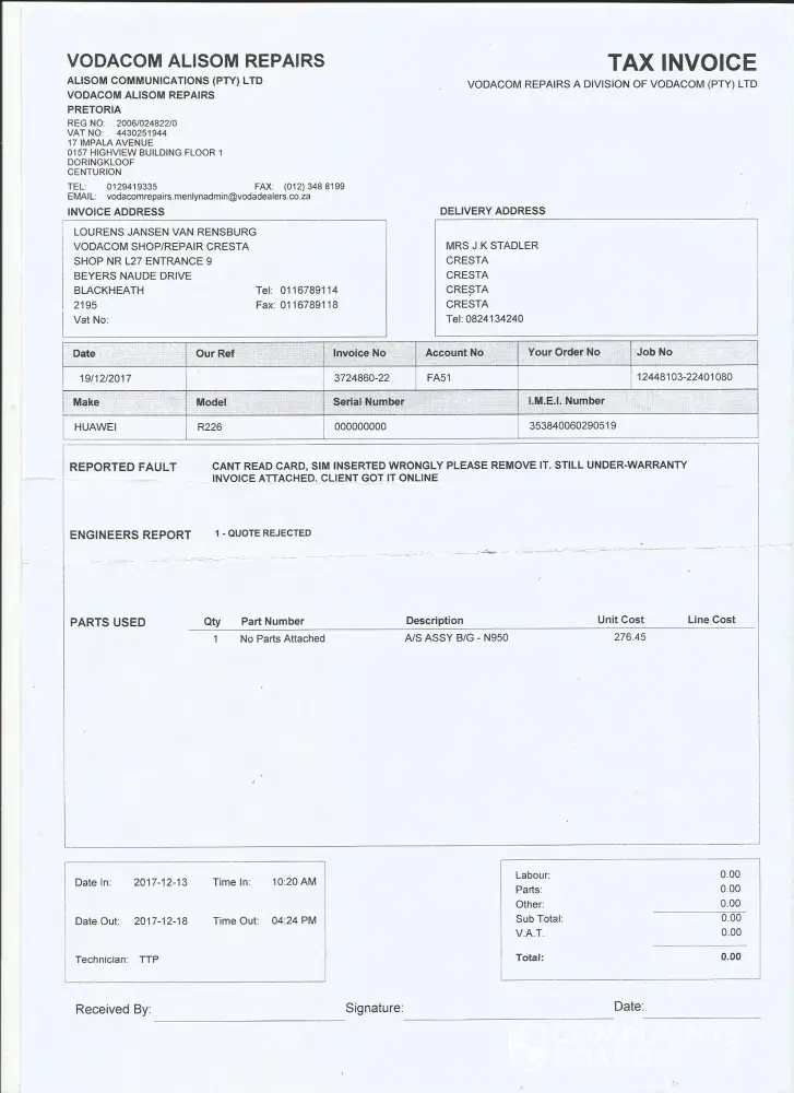 I went to Vodacom Customer Care in Cresta on 19 December 2017 and asked them to book the unit in and please remove the sim for us so that we can replace the sim in the correct manner.