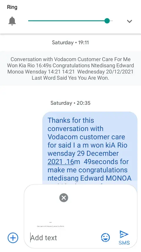 Yesterday 29 December 2021 14:21 16min 49sec. Nonhlanhla nakeng as Vodacom customer care said you won Kia Rio call from:[protected]