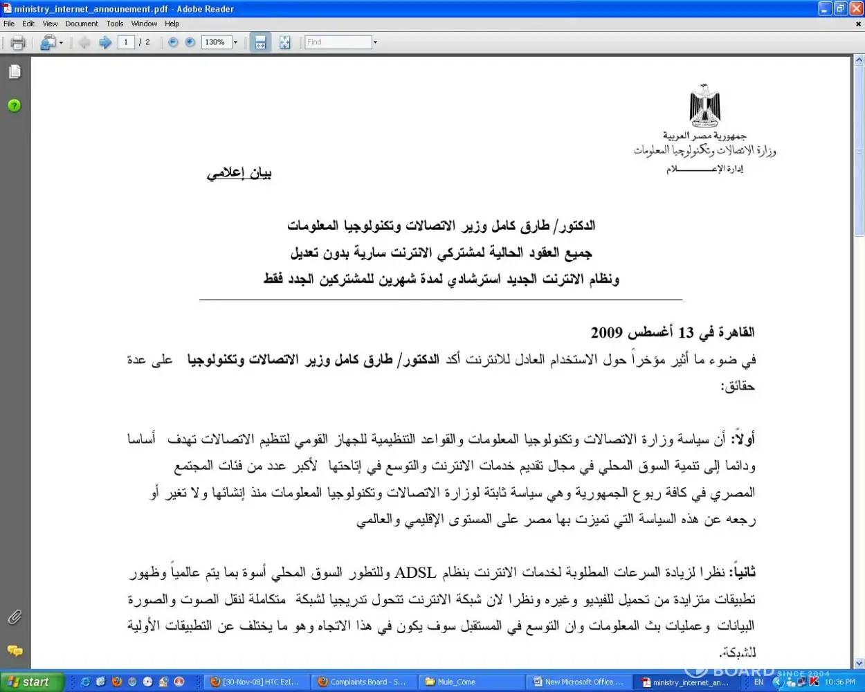 The Next day I found the official statement the was released by the Ministry of communications on 13/8/2009 and I was shocked to find that the official statement had a separate band stating that the new policy is in the experimental phase for the next two months and should be applied to the new subscribers only ((MEAN WHILE THE CURRENT ACCOUNTS STAY WITH NO CHANGES)) concerning the protection of the customer usage rights.