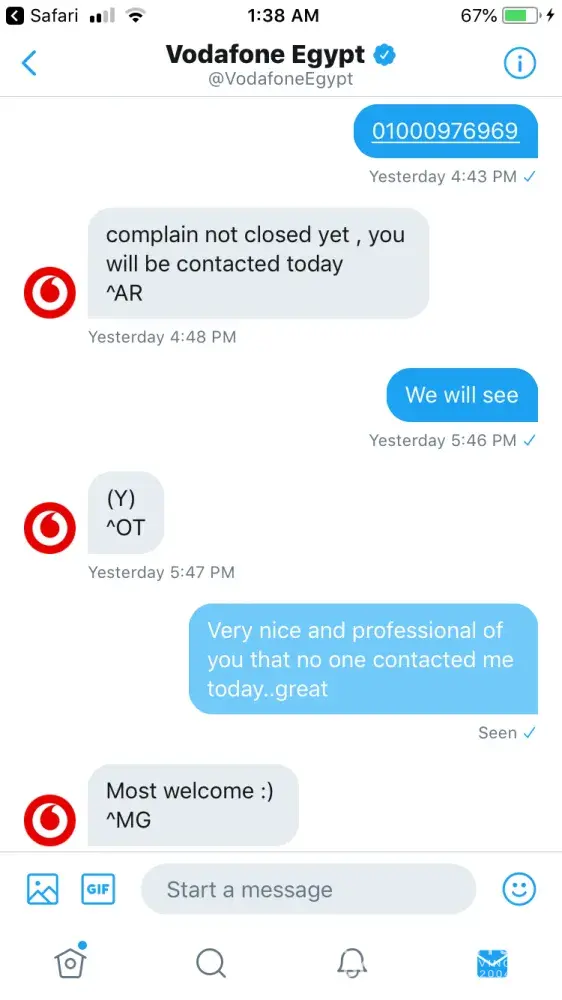 I have a serious complain on Vodafone Egypt customer service, i was travelling to Paris from the 14th to 17th this month and i called to open the roaming and i had a complain as well and i upgraded my package to traveller and the Customer service agent told me that i will be now enjoying 1.5 GB and 45 min free roaming to found out after i got back that my invoice came with almost 1.5 after dediction to an amount from a previous complain and when i called again they told me no you shouldn't enjoy the whole package and the customer service agent should have told you so since the i made a complian almost 5 days ago and no one contacted me for 48 hours and the when i called u told me u will call back and the they called twice while i was in a meeting and never again, when i came out i called you and someone said they will check and get back to me which didn't happen, the 2nd day i called 9 am and a lady teplied ok will check and no one called me for 13 hours till i called back and a totally unprofessional customer service replied that we closed your complain because u didn't reply and the told me the complain policy to call u 3 times and the again said that he don't know the policy and he has nothing to do with them, and that he is from another department and that i still should wait for someone to call me..which of ourse again never happened and finally your twitter account told me that they will contact me and then didn't happen and they were totally u professional in replying
