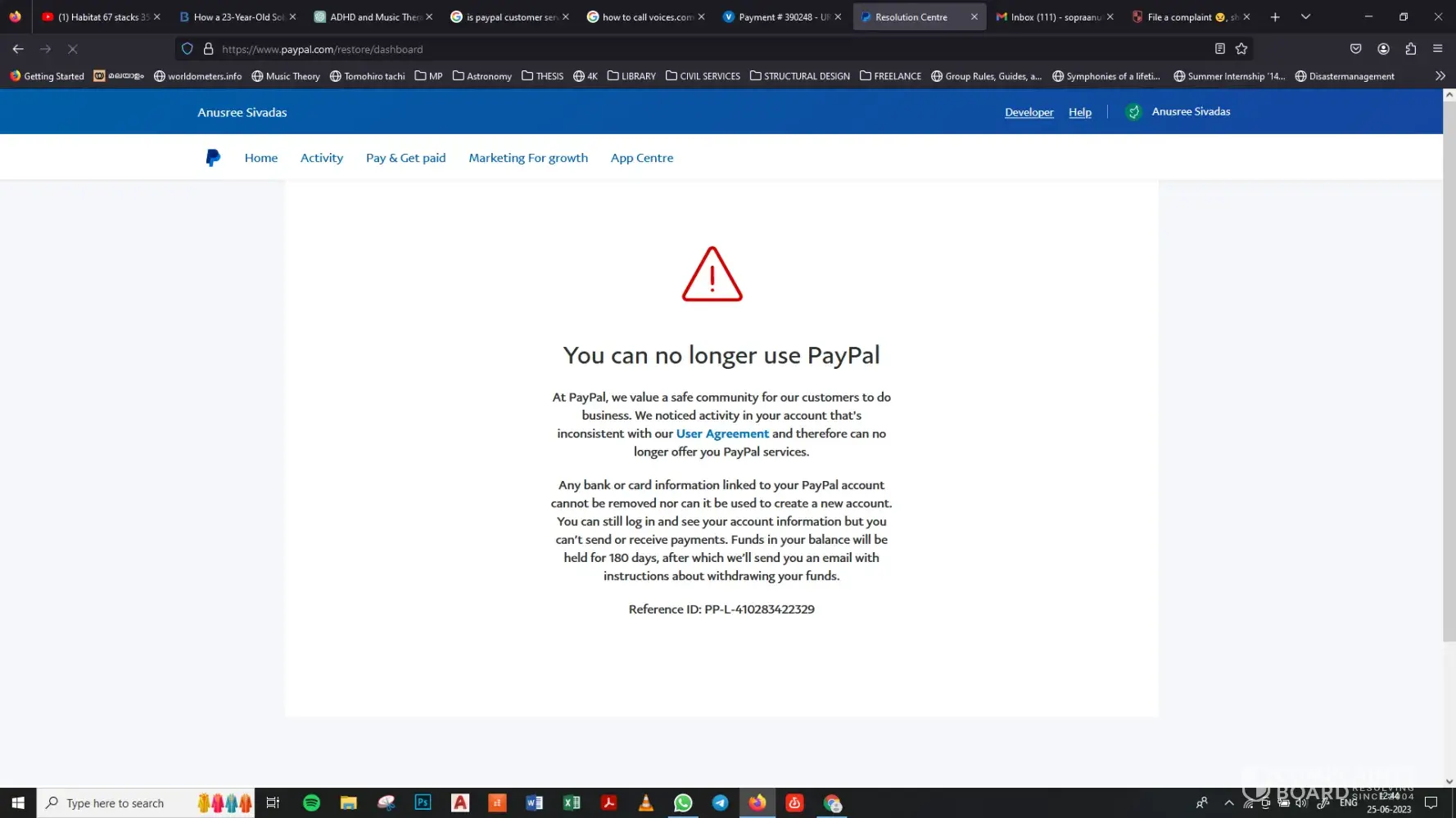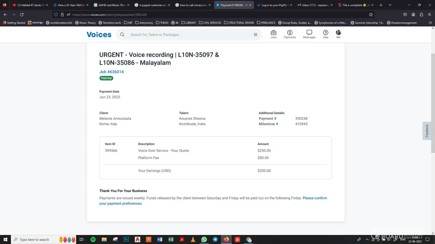 But to make things worse, PayPal has disabled my account citing some unusual activity. I called their customer support and they are saying that it will take 3-5 days to get it sorted. Five days are over since I filed my complaint and so far there is no progress from PayPal. I reached out to voices customer service too, but I didn't get any assistance other than their automated messages that said they'll revert in 2 days. It's been 4 days, and still no response. As of now, the payment is seen as 'Paid Out' on voices.com, while I haven't received any money. Attaching screenshots of voices.com & PayPal.com Interfaces.