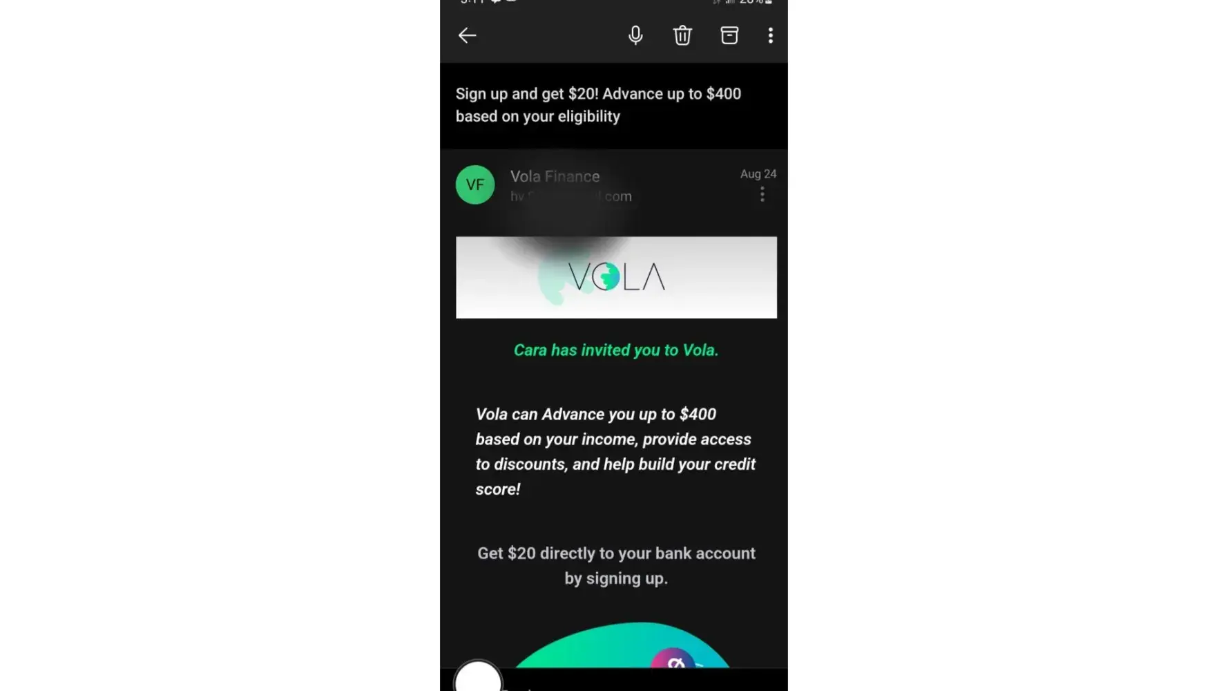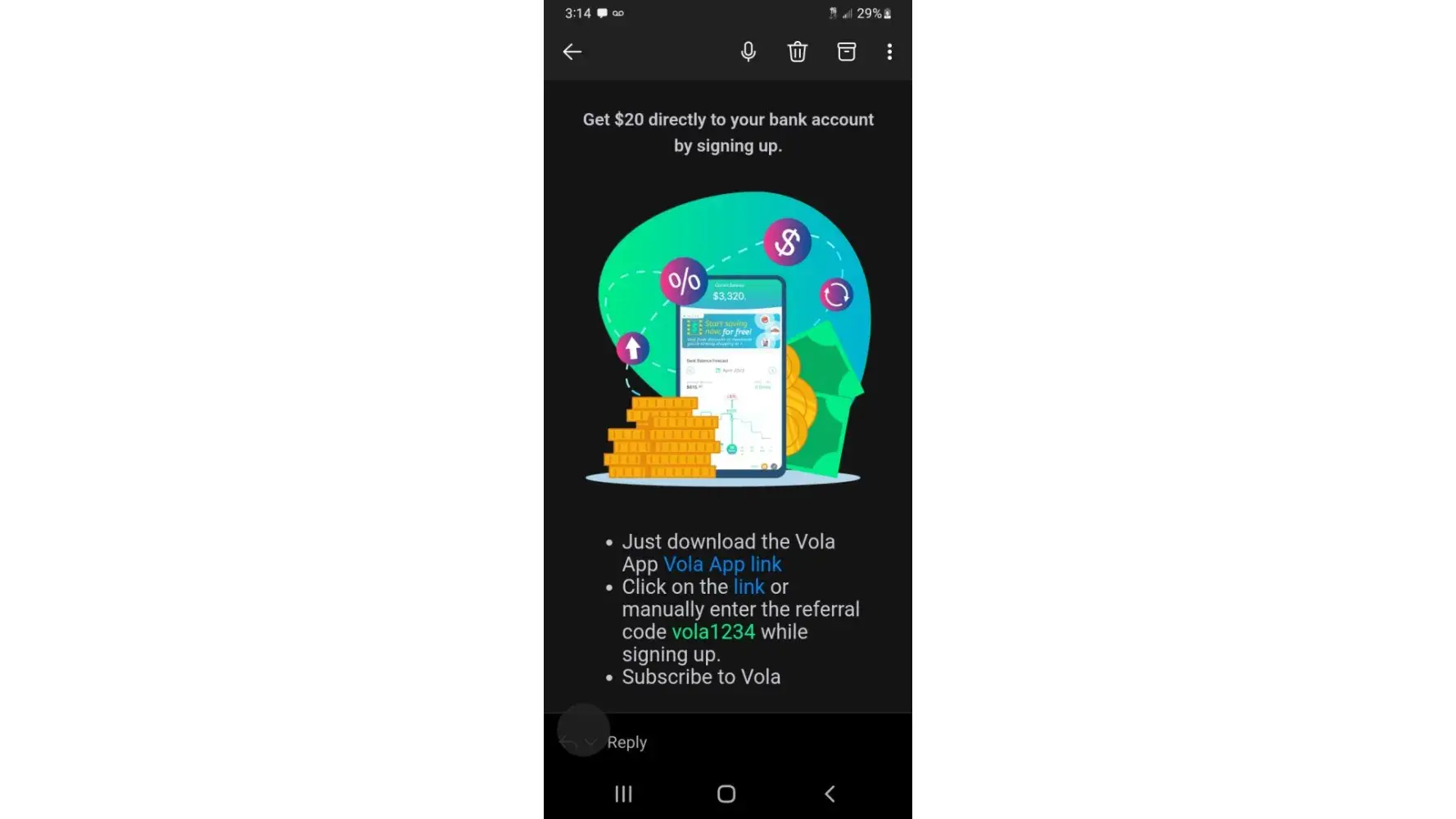 I got an email with a referral code VOLA1234 that stated I would get $20 immediately deposited into my account using thst code simply for signing up. Venmo is not good enough, although they work with venmo, to deposit my $20 into so, I never got the $20. I sent customer service an email 2 days ago now and nothing in response.