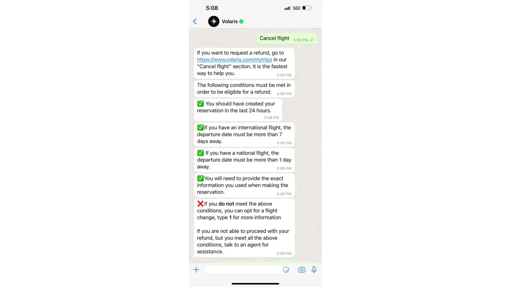 I scheduled a flight for nov 2023, payment was made saw an error on the flight itinerary, within 20 min I tried to cancel the flight it didn't allow me it said to call, I called, I couldn't get a hold of anyone it kept saying 10 people before you. I even texted, it says in the wassap app that if I made the reservation within 24 hours and I didn't check in or my flight if it wasn't an international flight that was more then 7 days away, if the national flight wasn't more then 1 days aware, I met all criteria and I was ignored and refused my cancelation and refused my refund.