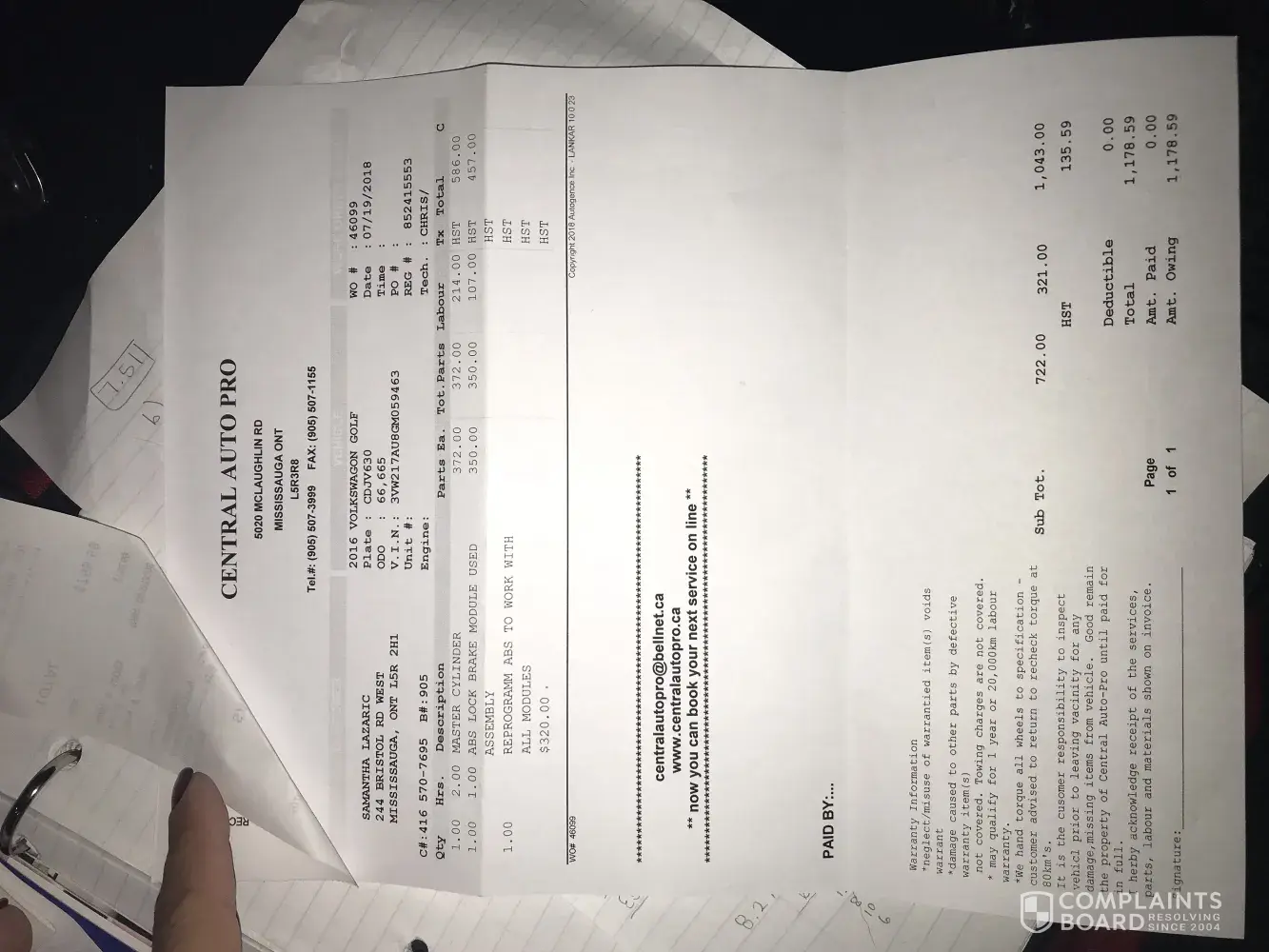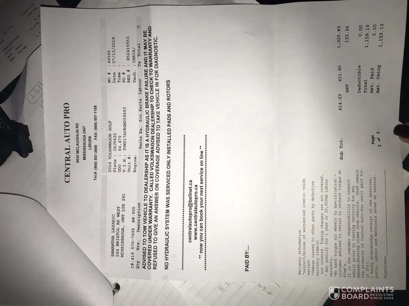 I replaced my rotors and brake pads at my mechanic because I was told it would not be covered under warranty by Volkswagen. I then made an appointment for Monday July 16th at 3:00pm with Brandon at 401 Dixie to get an assessment and potentially fix my master cylinder. My car was towed to 401 Dixie on Friday July 13th.