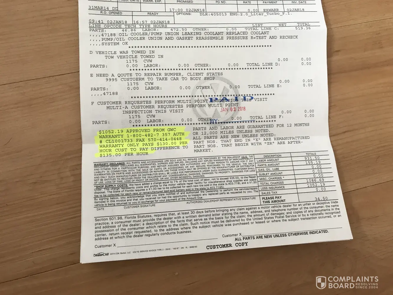 The insurance company did thier job of covering most of the damage. But the VW workshop people have not performed those work that has been already claimed n passed.