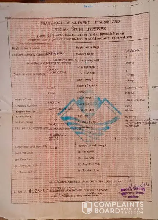 It is to inform that undersigned had bought Volkwagen Vento Car in the year 2014 from M/s Pvt. Ltd, Rampur Road, Haldwani, Distt: Nainital. The registration no of my car is UK01: A8000. The car running satisfactorily for around 3 years but around one & half year ago the car was given to M/S Maa Sheetla Autowheels, Haldwani for its servicing. After taking the car from servicing, when I drove around 15-20Km from the service centre, suddenly the car stopped & unable to start again. The matter was immediately informed to manager service centre and with the help of service centre the car was taken to the same service work shop and after diagnosis it was found that no engine oil was filled by the service personnel and even in the petrol tank the diesel was poured and due to which the engine of the car was ceased.