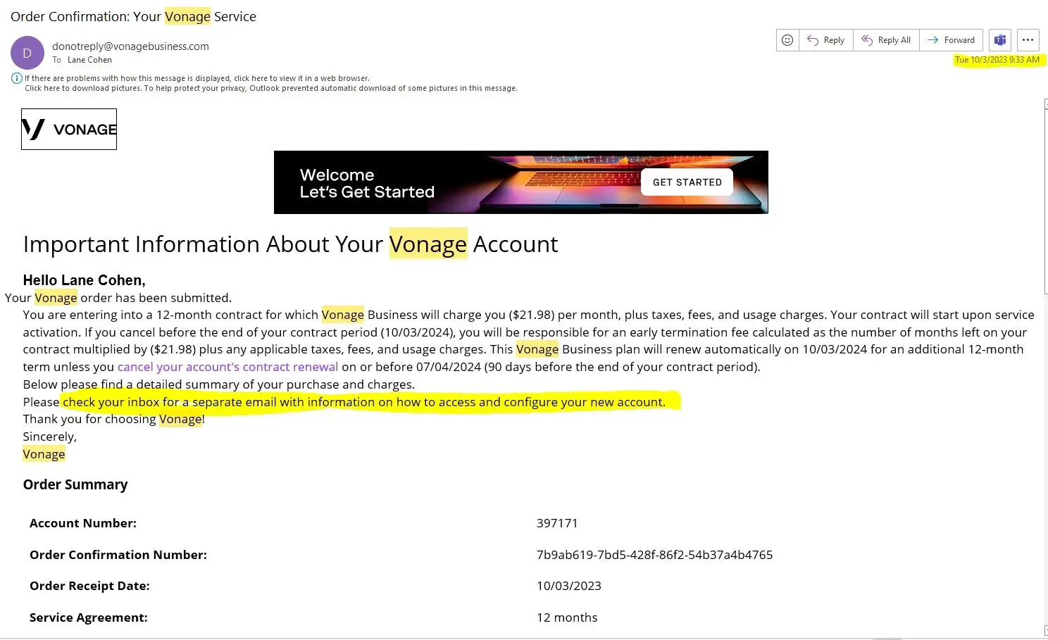 On 10/3/23 I began a setup of a Vonage business account for Marcon Cleaning Group, INC. so that I could have a registered business phone number. I received a confirmation of my order online and an email receipt and confirmation. Both messages indicated I would receive a separate message on how to complete the account set-up and receive my login and phone number. It has been more than 48 hours, and no additional information has been provided to me. I contacted Vonage via telephone to inquire and was not provided any assistance. I was charged for a service that I am not receiving. They would not authenticate the account. No questions were asked to authenticate.