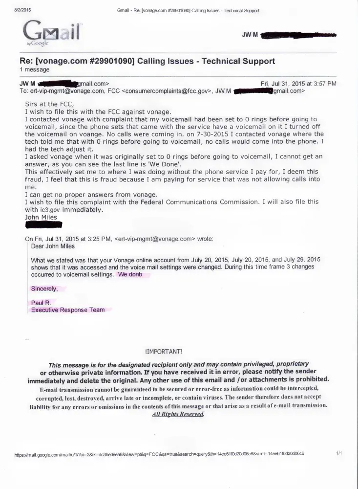I was not getting calls on my phone. I called tech support. I had them fix the settings. When I contacted VONAGE to find out how long this miss setting had been in place, how long I had been going without the service I paid for, when this miss-setting had been put in and by whom ... The reply I got was BS information that did not apply to what I asked AND "We Don" from the Executive Response Team. No help, No proper information since Vonage are the only ones with access to this information ... I have filed complaints with IC3.Gov, FCC, FTC, BBB since the response FROM THE EXECUTIVE RESPONSE TEAM was 'WE DON' ... I hate it when any company has the attitude of 'We do not have to provide the service or customer service BUT IT is your Obligation and Privilege to pay us'. I am a paying customer, I deserve both the service I pay for AND I deserve proper customer service and answers to my questions. NO CUSTOMER DESERVES THE ANSWER OF 'WE DON'..Anyone who has problems with Vonage without proper help from Vonage, File with IC3.GOV, File with FCC.GOV, File with FTC.GOV