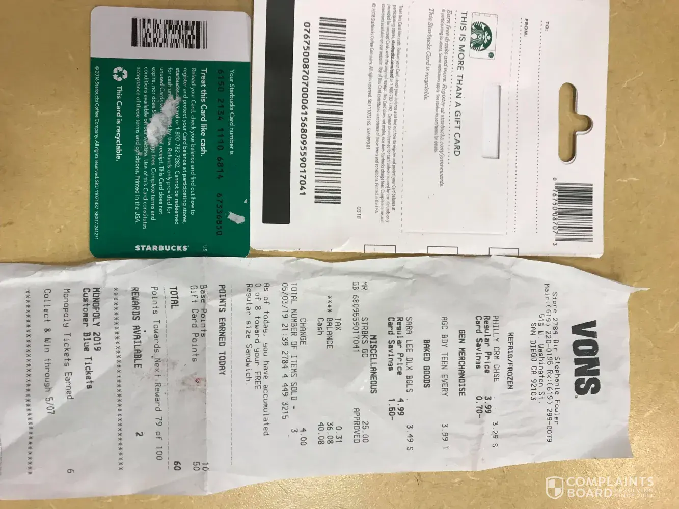 Today, May 8th, I went to Vons to complain. First, the pharmacy person, who had just arrived, offered help. She told me that the Starbucks card number did not match the number from the packet. She said it was a different card. I had to call my daughter to confirm that was the card. She passed the issue to Kevin at Customer Services. She explained my problem and Kevin said that that has happened before with Starbucks and the numbers not necessarily match. I added that, actually, it happen to me before, but I did not complain because I did not have my receipt. Since it happened before, he gave me a Vons gift card. "Something they never do, " he added. He also mentioned that I could buy another Starbucks gift card, but they would not be responsible if it did not work because it was Starbucks error, not Vons. I was very upset to hear this. I was not going to buy another card and risk having the same problem and no solution! I also was not going to give my daughter a Vons gift card for her birthday! I insisted they were responsible. He insisted not their problem, but Starbucks, and there was nothing they could do. I suggested stop selling Starbucks gift cards since "they are the problem." He replied, "We can't do that". Who is responsible then? I am the costumer, not me. Please let me know when I can go back to buy Starbucks gift cards with the assurance they will be activated; and if not, I will find the solution within the store with polite staff. I, more and more, go to Vons because of convenience, not service. And now, it is turning inconvenient. Sincerely, Susana De La Cruz