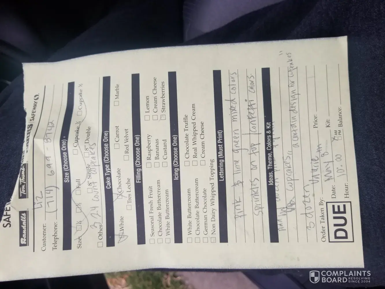 I have 3 24count cupcakes we ordered and paid April 28 and was supposed to be picked up May 8. We were not able to get it because of an important errand and I am here today ay Vons Montebello May 9 arrived around 10:05 and our order is not ready and the pastry manager and store manager dis not even bother yo quickly resolve the problem but instead made me wait 25 minutes as the pastry manager who also do the piping is on lunch and the store managers are on a "conference". This is how the customers are treated in this store? I am still waiting as of now for my cupcakes it's already 10:43.