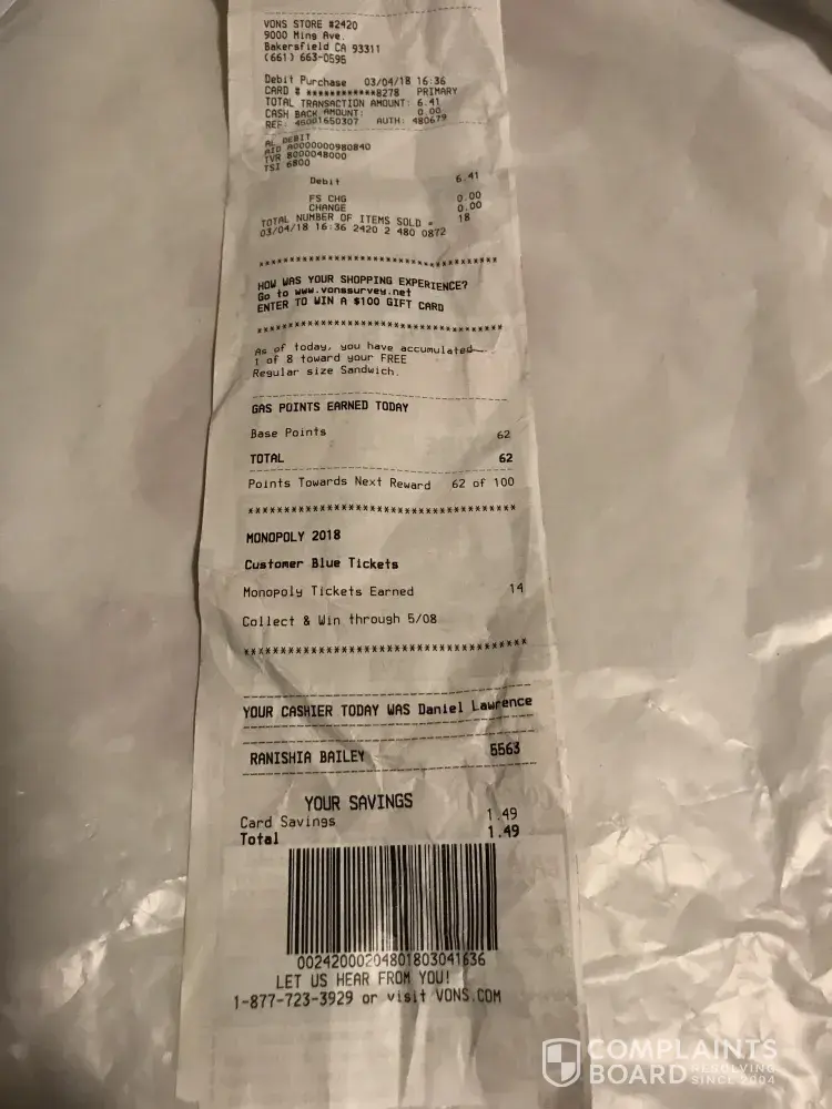 vons should never treat a person that way, the security were very bias, and the cashier was very not trained and should have better judgment she was at wrong here and made things why wrong and because of the way she handled this satiation very poorly and to have your live under threat
