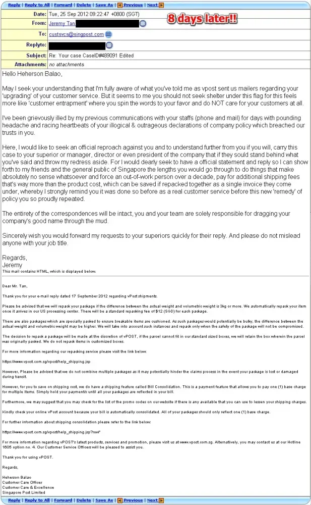 I later sent another email to vpost saying that i would like to have the items delivered to another courier service, again, no reply for days until I called their hotline. The most silly reply i received was because I did not send them the merchant invoice in an 'attached' form when I've already keyed in all the information inside the email. I asked what did they mean by 'attached', is it to copy paste the information into a word document and send it to them, they said yes. This is by far the stupidest thing i ever heard. I said all the info were already inside the email, what for do I have to send an attachment ?! And it wasn't even stated as a requirement previously by vpost ! They told me they have to follow guidelines. Seriously, what kind of idiotic guidelines are these !