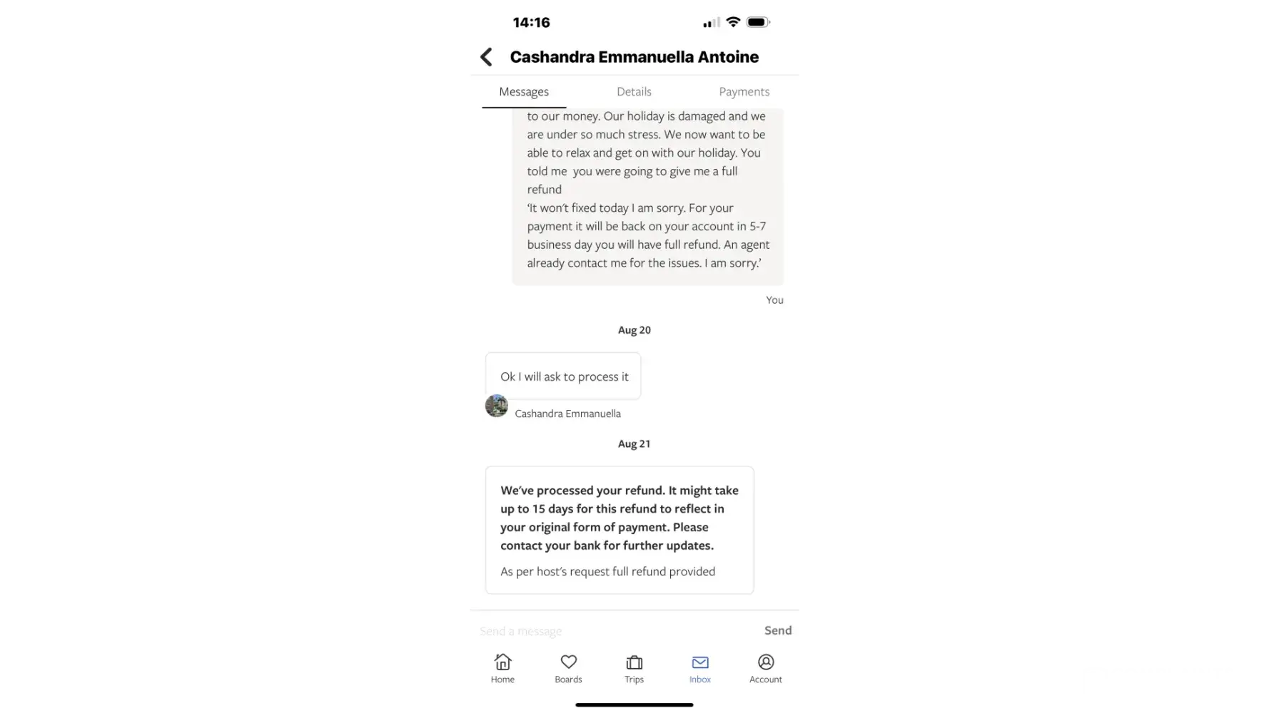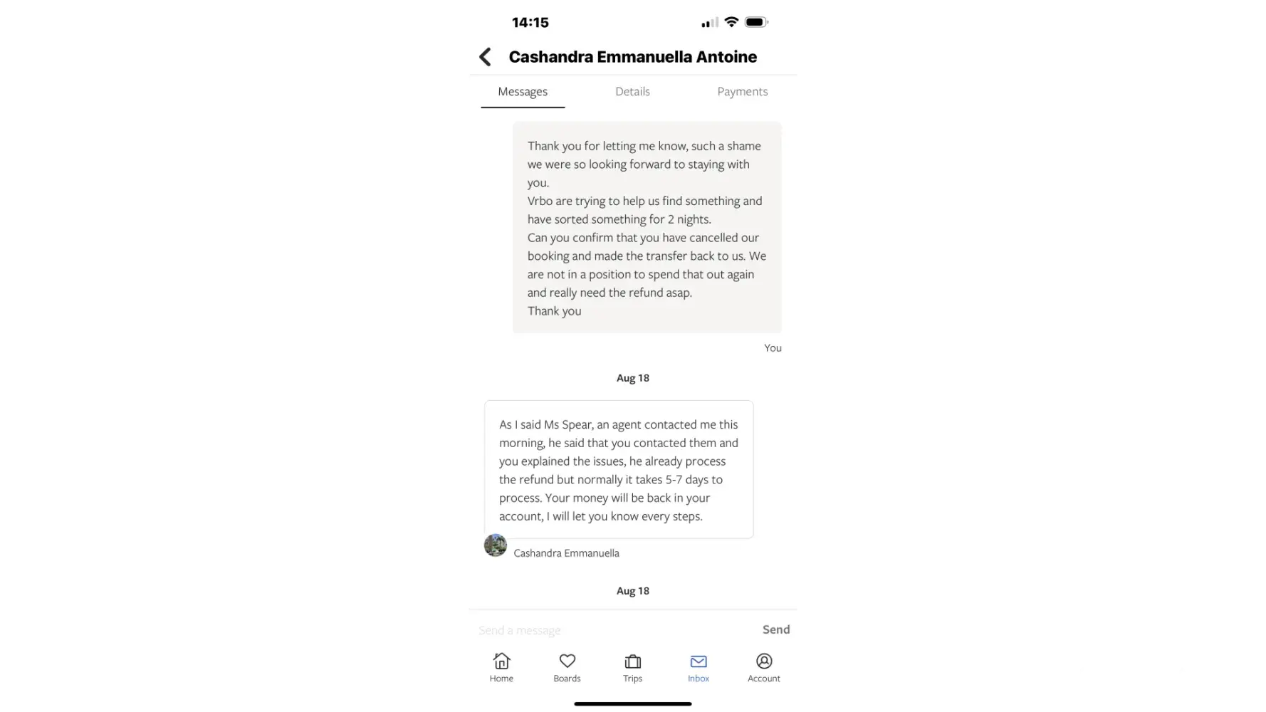 I had to use our car hire money to pay for replacement accommodation as the refund was very slow and sent in 2 parts eventually
