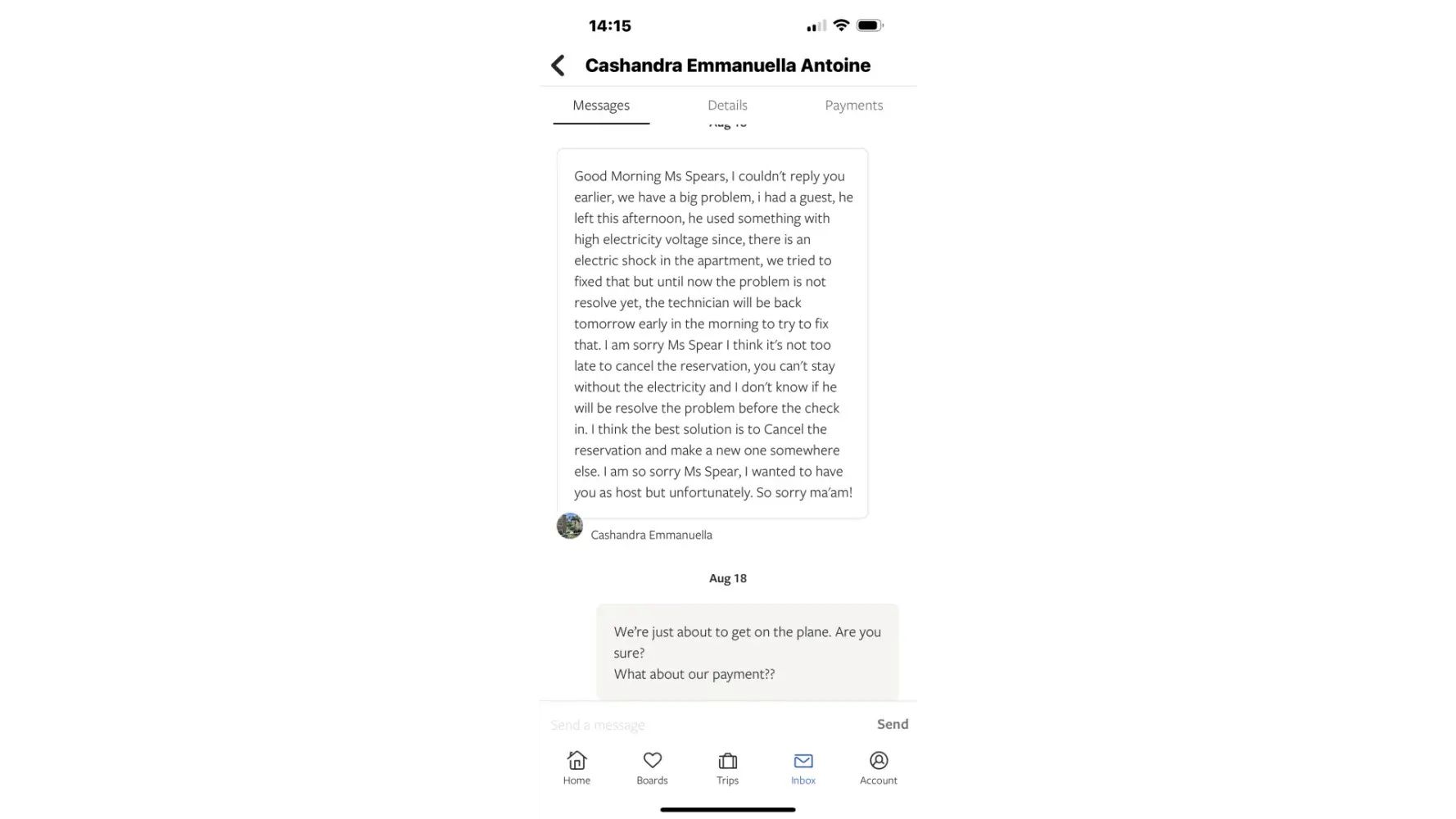 Just as we had gone through UK security at Gatwick and were waiting for our flight, the host messaged to say there was an electrical problem and we couldn't stay there.