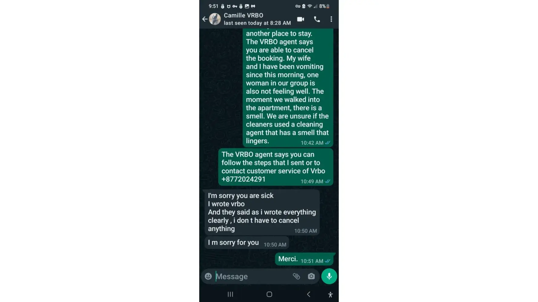 I immediately contacted the host at 4 pm and shared our concerns. She declined to take any action to cancel or refund the reservation. I contacted VRBO Chat and Dennis B over the next 40 minutes explained steps that the host could take to cancel the reservation. I sent the host all the information. She wrote that she contacted VRBO and according to her VRBO stated that she did not have to cancel the reservation. I phoned the host and asked if she could charge us for the first night and rent the apartment out for the other nights, but she declined.