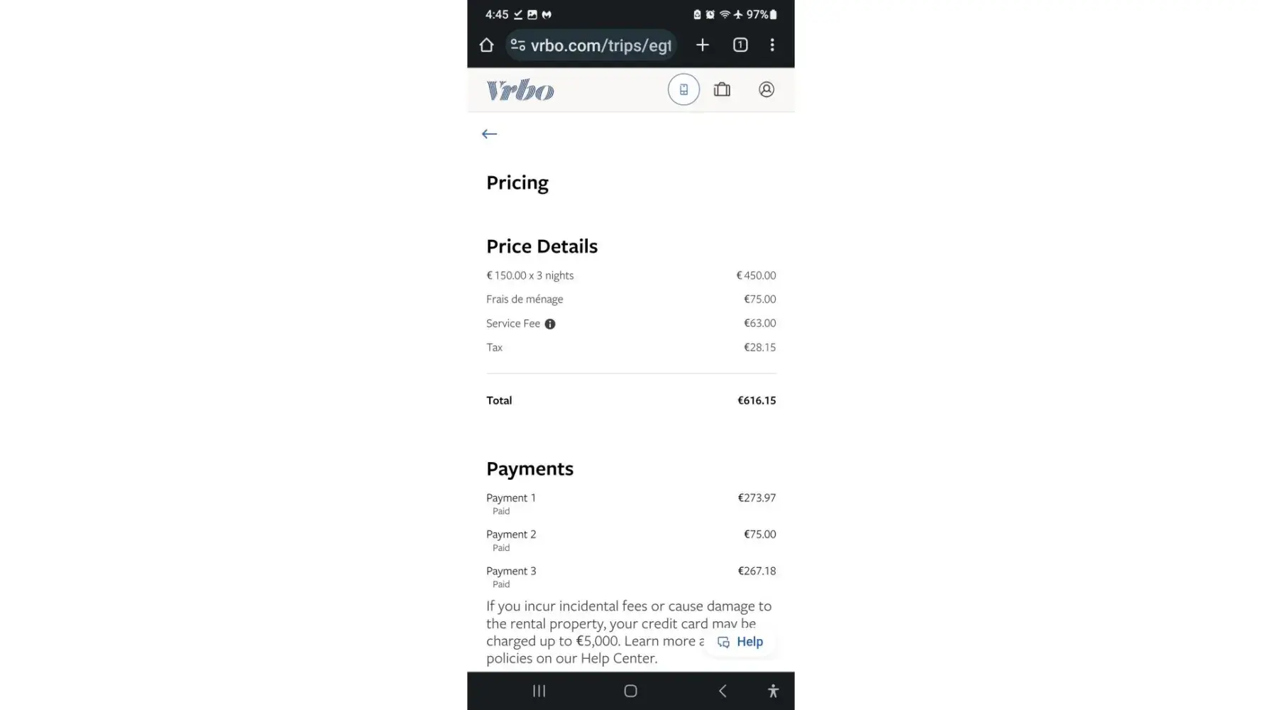 Claimed loss: We had to book 3 hotel rooms in the place of the VRBO stay.