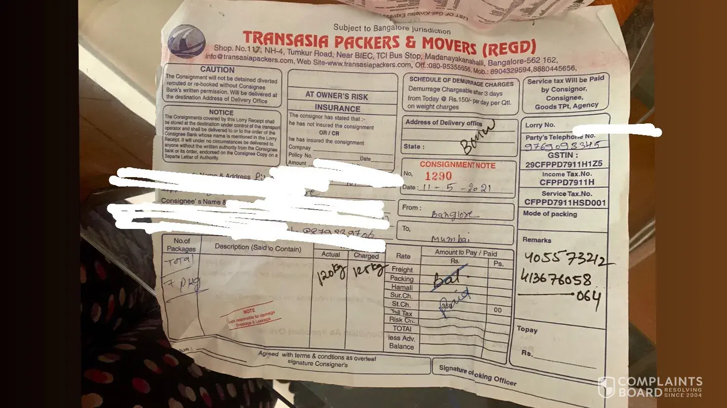 Now when the boxes arrive, I check the weight which is also mentioned on his own receipt which is 120 kilos. And he says I can file a police complaint even then they will not refund the money they have wrongfully taken from me.