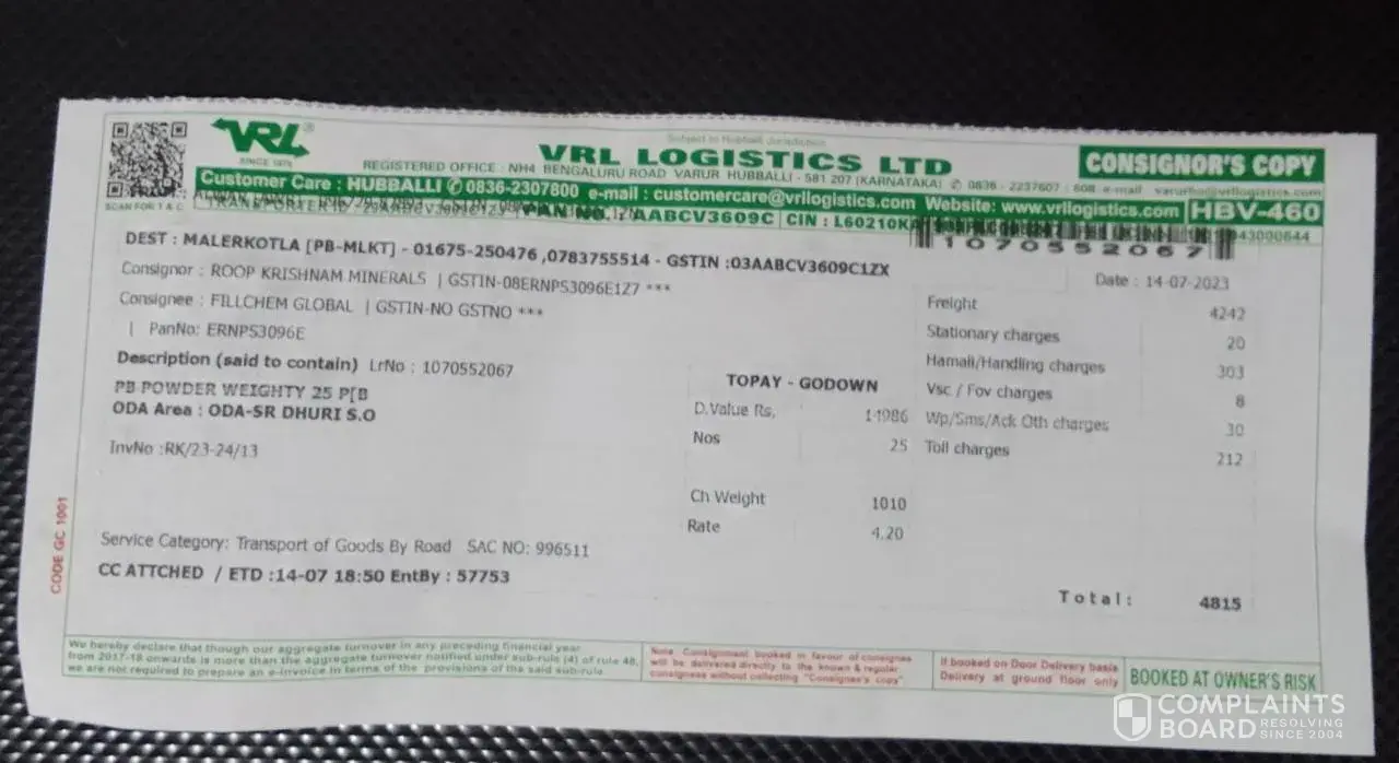On Dated 14.07.2023 a shipment of Calcium Chloride quantity One Ton ( 25 Bags of 40 KG Each) was booked by our Consignor M/s Roop Krishnam Minerals from your Alwar Branch . On 20.07.2023 when our employee reached your Malerkotla branch to take the delivery of this material, it was not in good condition. Our staff person informed us that material is completely wet and none of our use now. When we talked to the concerned person at VRL Malerkotla branch, they told us that it happened as there was flood in Ambala Region. We refused to take the delivery of this shipment because the material was completely wet, stained and none of our use. (Images enclosed)