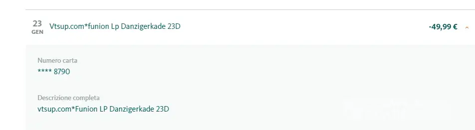 Ho ricevuto un addebito sulla mia carta di credito senza che io abbia sottoscritto nessun abbonamento. l'addebito arriva come descrizione su estratto conto da: vtsup.com*Funion LP Danzigerkade 23D. Non si capisce neeno chi sia la società che addebita.