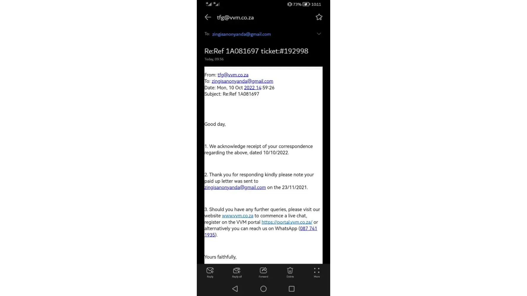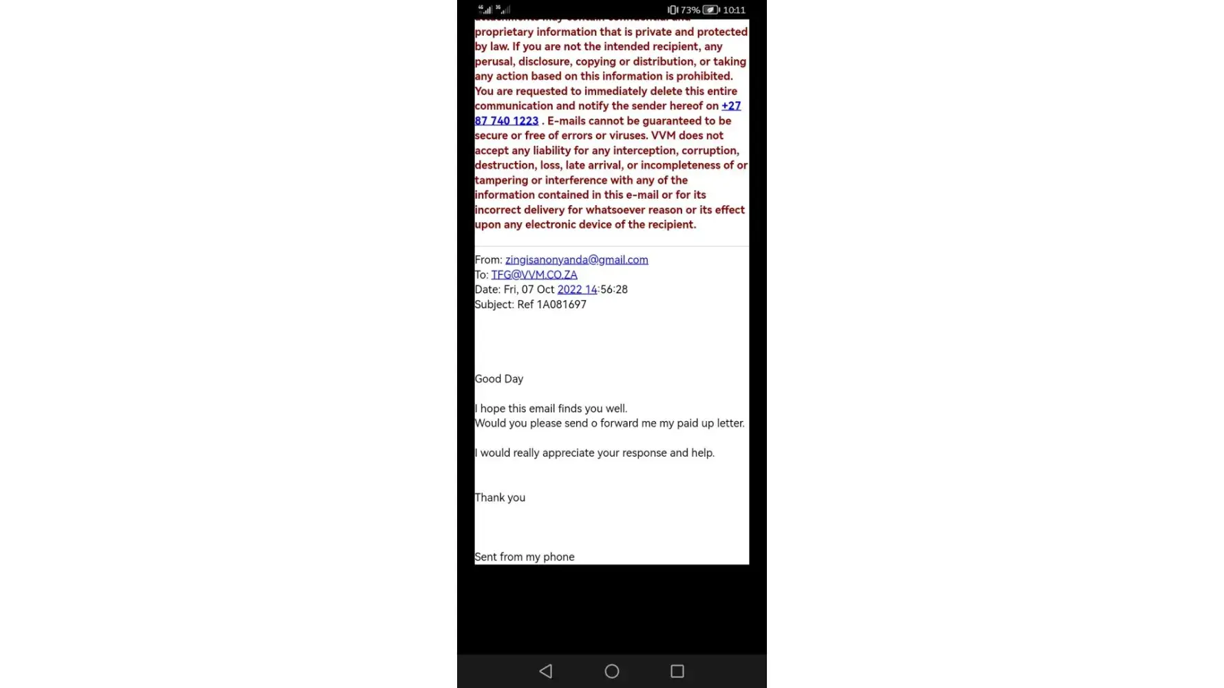 On the 07th of October 2022 I wrote an email to [protected]@vvm.c.za email address to resend of forward my paid up letter they sent to me o. 23rd of November 2021. They relpy to my emails that they need reference number which I included in my email as a subject. I sent again another email explaining why I need it to be forwarded or resend, they ask for my ID number and I've been phoning you guys a lot I've been send to this side and that side and the your people are rude.They want to send me to homechoice while I don't have anything to do with a homechoice.