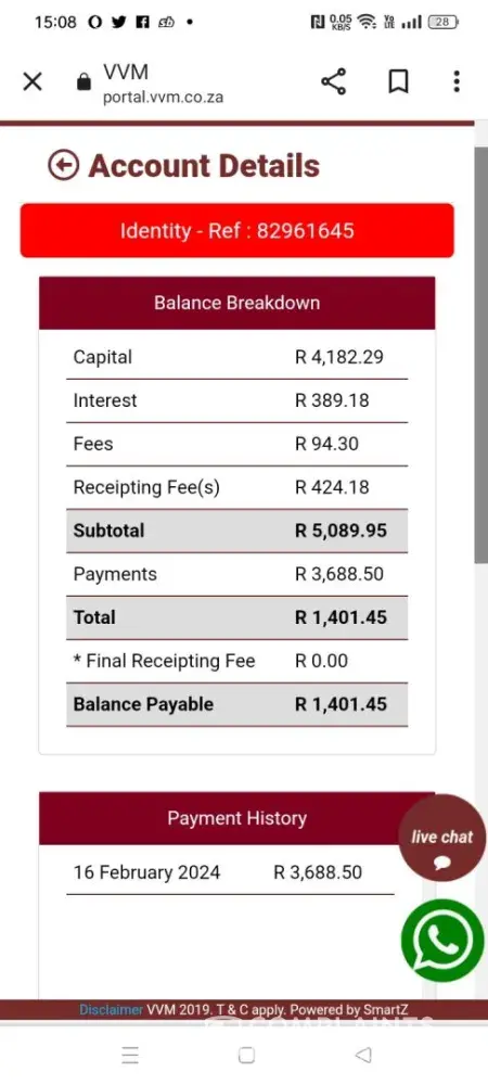 Thabo Alex Montlha, ID 🪪 [protected], hereby confirm that I contacted VVM for an Identity account Ref number: [protected], settlement amount, on the 15 February 2024