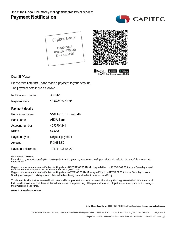 I made a payment of R2 013.00 to VVM attorneys on the 23/11/2021 to account number [protected] which was given to me by a agent working for VVM. This member till today has not been resolved as VVM claims that they did not receive any payment from me while they agree that the provided account number belongs to them.