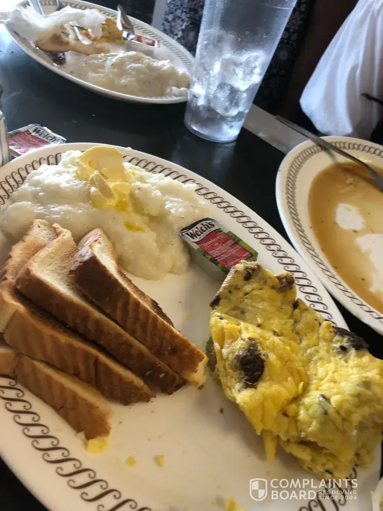 Cold food. Took thirty min to get coffee. They were asking if there was anything else we needed and I still didn't have my food. Had to ask for a refill, creamer, Splenda, syrup. I got sausage but not the rest of my food until I told a different server I still didn't have food. Was there for 1.5 hours just trying to get to our location. Also got charged for water. WTH?!