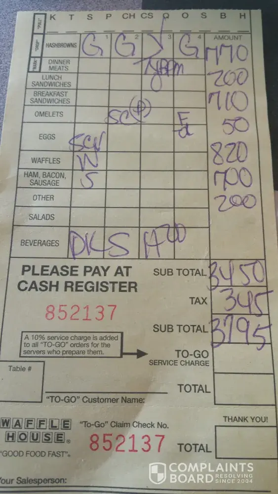 I love waffle house. I have been eating at waffle house at least 2 times a month since I was old enough to drive. Last night I had the worst experience I have ever had! As soon as we walked in Jessika, the waitress, asked how many we had in our party. I said we have 13 total people. Her response was "are you freaking kidding me?" She huffed and puffed the whole time. I'm not typically a germaphobe, but when my waitress is continuously scratching and digging at her scalp it turned my stomach. She NEVER washed her hands! Before she brought us our food I asked her to wash her hands and apparently it made her mad. She never brought my bacon or my daughters bacon and my hashbrowns didn't have ham in them. She sat out food down and never came back to the table. The other waitress checked on us once and I told her what we hadn't received and she brought it to us. We never got a refill on any of our drinks. I ordered an all star with an extra side of bacon with my hashbrowns covered & chunked, the waffle from my all star and the side of bacon was for my daughter. My husband ordered an all star with his hashbrowns smothered and covered & my son had a waffle and eggs. My son and daughter both got drinks and my husband and myself both got water. Our bill was $41.92!