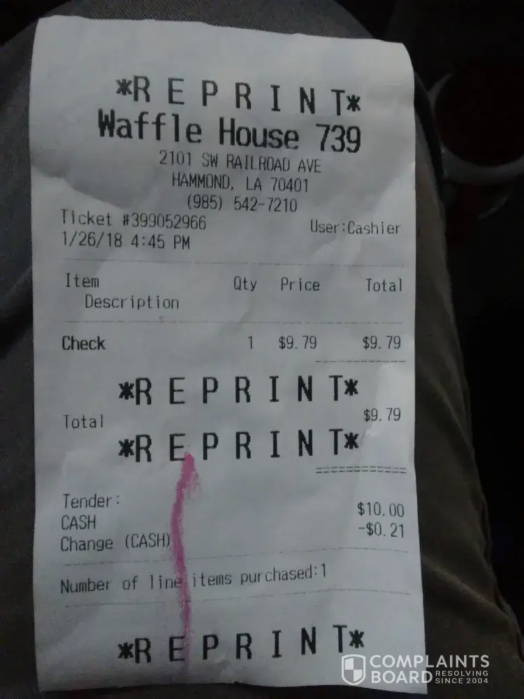 First, the staff was rude. Our server asked if we were ready and I asked for a few minutes. He kept asking and I felt rushed. I have 3 small kids to teach and handle. He was new, very impolite, and didnt even offer a smile. When we finally ordered it happened as followed: a milk and sweet tea for my toddlers and a sweet tea and water for me and my husband. I then ordered a waffle for the kids to split. I got the grilled bacon chicken cheese deluxe meal with no cheese. My husband got the all star meal with sausage. Server asked if I wanted anything else and I replied with a side of bacon. I received my chicken sandwich with cheese and sent it back. The first waffle was burnt and sent it back. I got my chicken sandwich back and there was a hair in the hashbrown. My husband then gets up and asked to speak to the manager and was told there was no manager on duty. The person he talked to was on her personal cell phone and having a ball. The server asked me about the hair and I gave him the plate. She brings the hair back and says she has no idea where it came from and that no one there had hair like that but would take 10% off our ticket. The original ticket was $18.67. She went to show the server how to fix it and she noticed a mistake he made which he didn't charge us for the bacon. She rewrote the ticket and the amount ended up being $23 and some change. The service was crap and we sent 3 items back one of which had a hair in it. There was only one other table being occupied besides ours. I spent the last of my paycheck taking my family out to dinner just to be treated like crap and with terrible food. Waffle house was one of our favorite places and we were really looking forward to it. We will never go back. I didn't appreciate the insinuations about the hair either. If I wanted a cheap or free meal I would have save that $25 and stayed home.