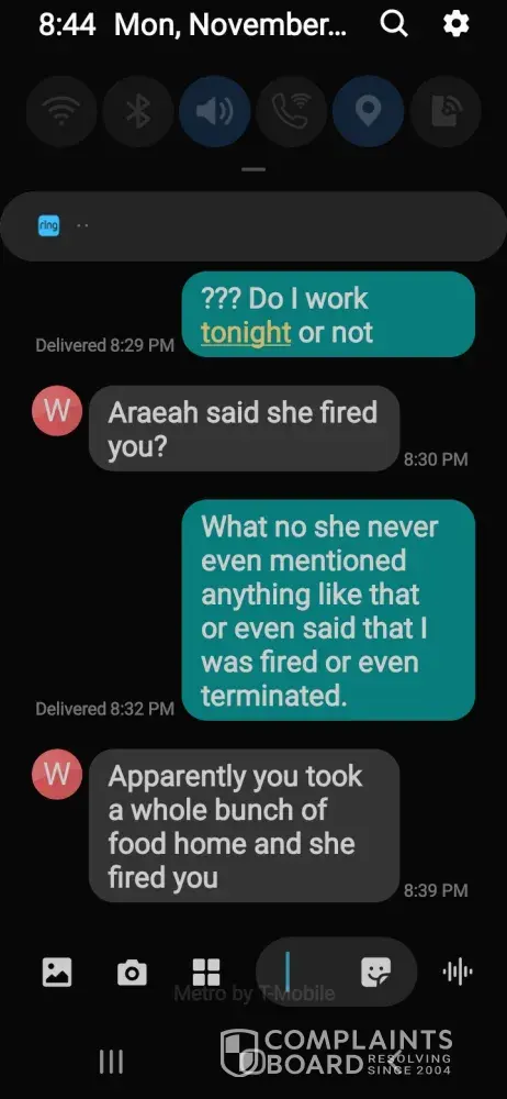So on November 17th I was accused of stealing food or taking food or something like that and one of my co-workers had called the management and said that that's what I was doing and district manager called said that I was to leave and I was been taking off schedule I wait a couple of days no calls or text, nothing I texted the manager to see if I was put back on schedule or what was going on and he said apparently I was fired on the grounds of hearsay no one check the cameras nobody talk to me no messages no calls or emails stating anything not even what went on. And no paperwork like I just want to do my job. I didn't take nothing home I didn't give anything free or anything why didn't they look at the cameras I mean why are they not doing their job there are cameras for a reason I've already called the hotline and everything, I have a case number it's about to be Thanksgiving and Christmas why would I take when I'm about to make so much more cause of the holidays come on all I want is my job I feel like why is no one checking on this to even see if it's TRUE or not. I was treated so unfairly.