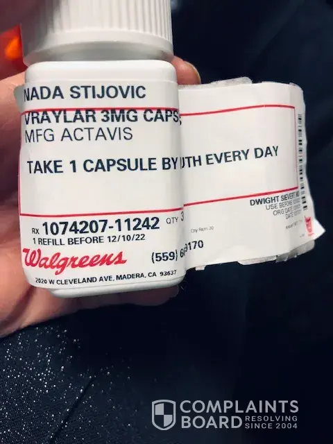 12/17/21 Maria the pharmacist @ Walgreen's 2020 E Cleveland Madera CA store charged me a $900 copay for vraylar 3 mg 30 capsules. The Prior Authorization had been approved the same day but she insisted that was the correct amount. I had covered care california Blue Shield silver ppo plan. Per Blue Shield the charge should have been $45.00 copay. Today I...