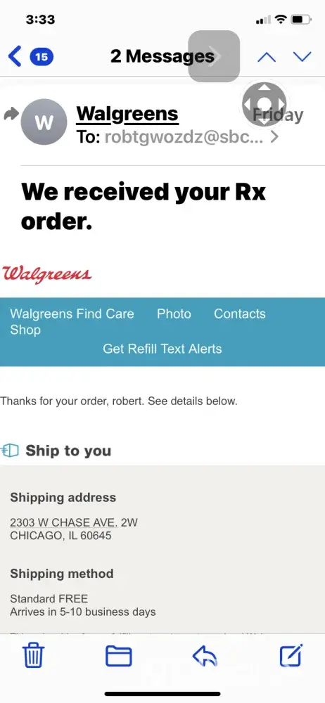 On May 16, 2021 I received a receipt that Walgreens. Com received my prescriptions. There were 3 and I had to reorder and pick-up 2 from Walgreens.