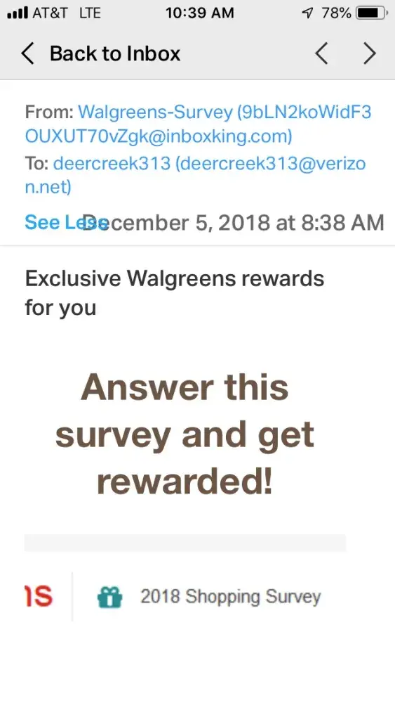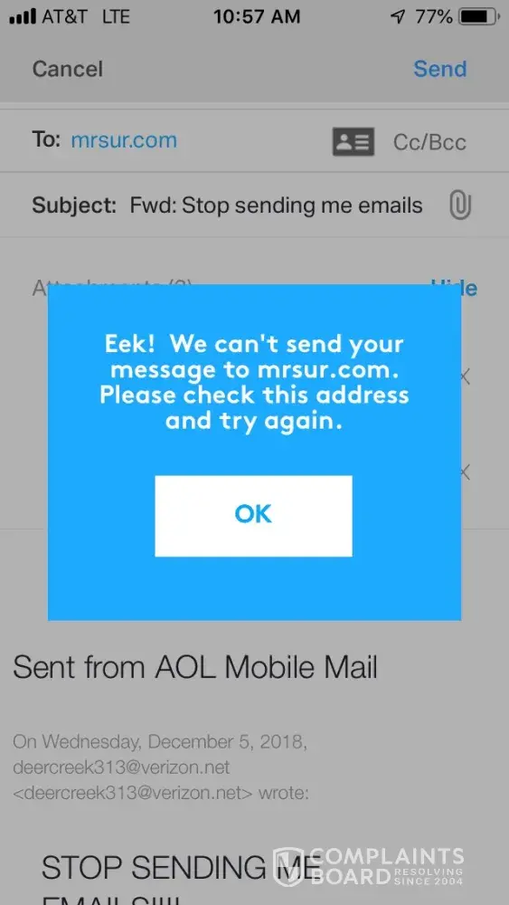 The company that says it is sending the survey is mrsur.com. It also gives a web address [protected]@mrsur.com. I've attempted to email this company several times. The email is returned saying it can't be sent. This company is representing your company. I don't know what kind of scam this is but I want it stopped. I have pictures of all of their emails. My next step is to report this to the NYS Attorney General's Office. Please stop these emails.