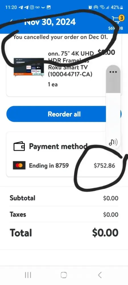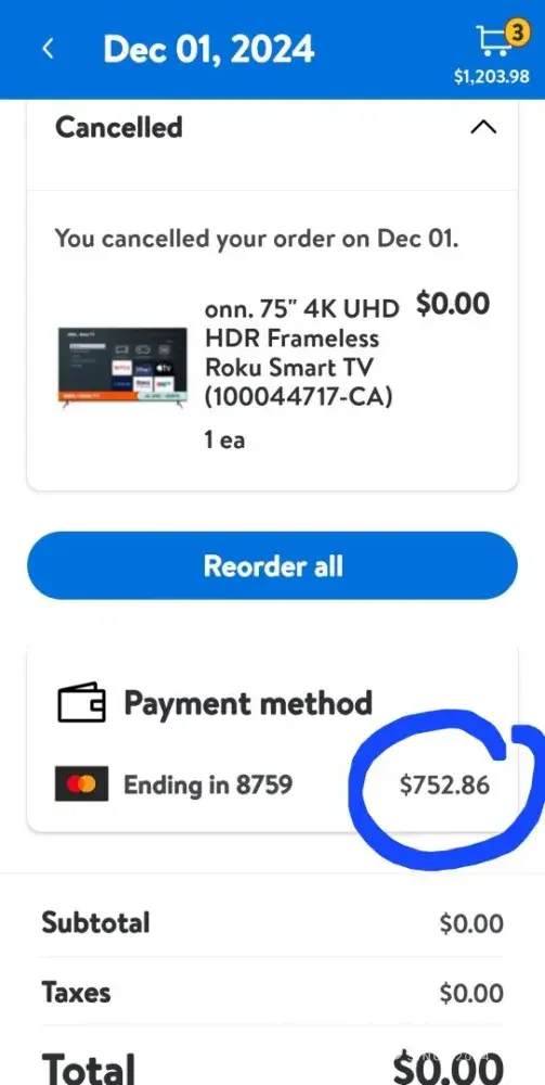 1. **Order Issues:** On November 30th, I purchased a TV for $752, which was canceled due to a "technical error." Unaware of being charged, I repurchased the same TV the following day, December 1st, and this second order was also canceled, resulting in the same charge of $752.