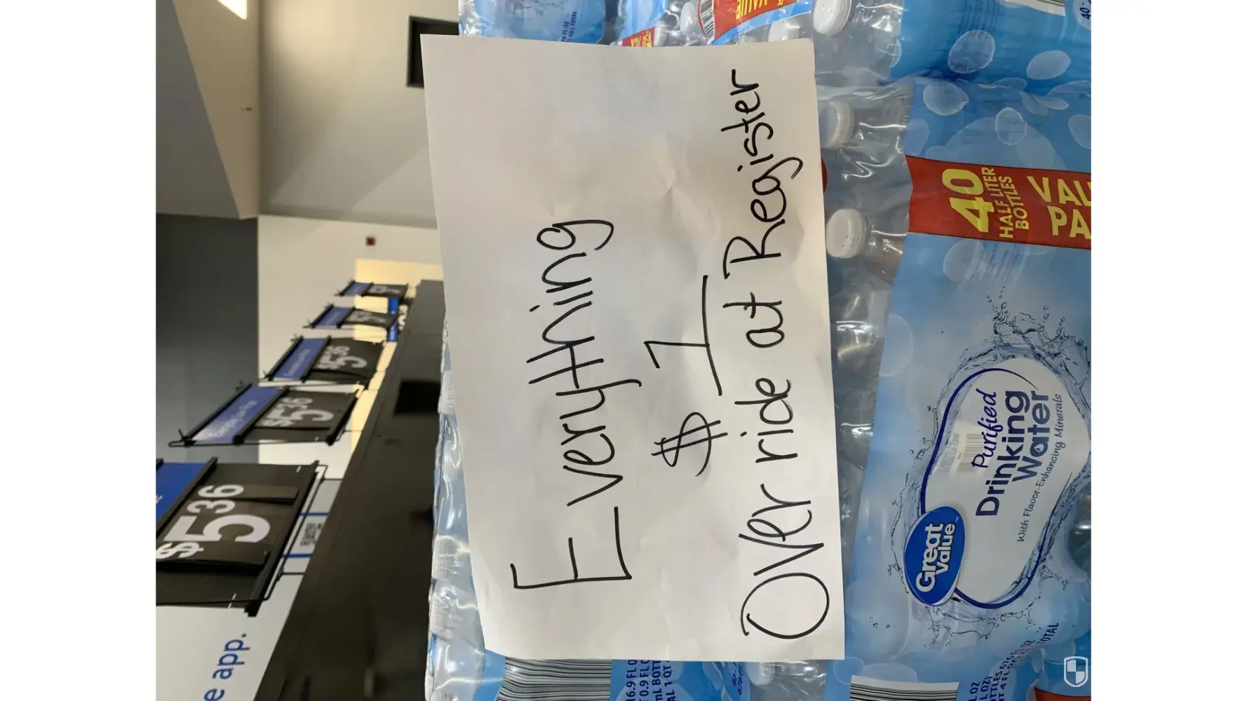 I asked for another manager who rubber-stamped what the first manager said. Somewhere in the exchange, it was implied I had added the $1 tag. I had two shirts with the same logo. The second one did not have a $3 tag. It only had the $1 tag. I was told someone from apparel would have to approve the override. They were not going to call anyone from clothing for me. I taped the sign to some water bottles by the register and took a photo.