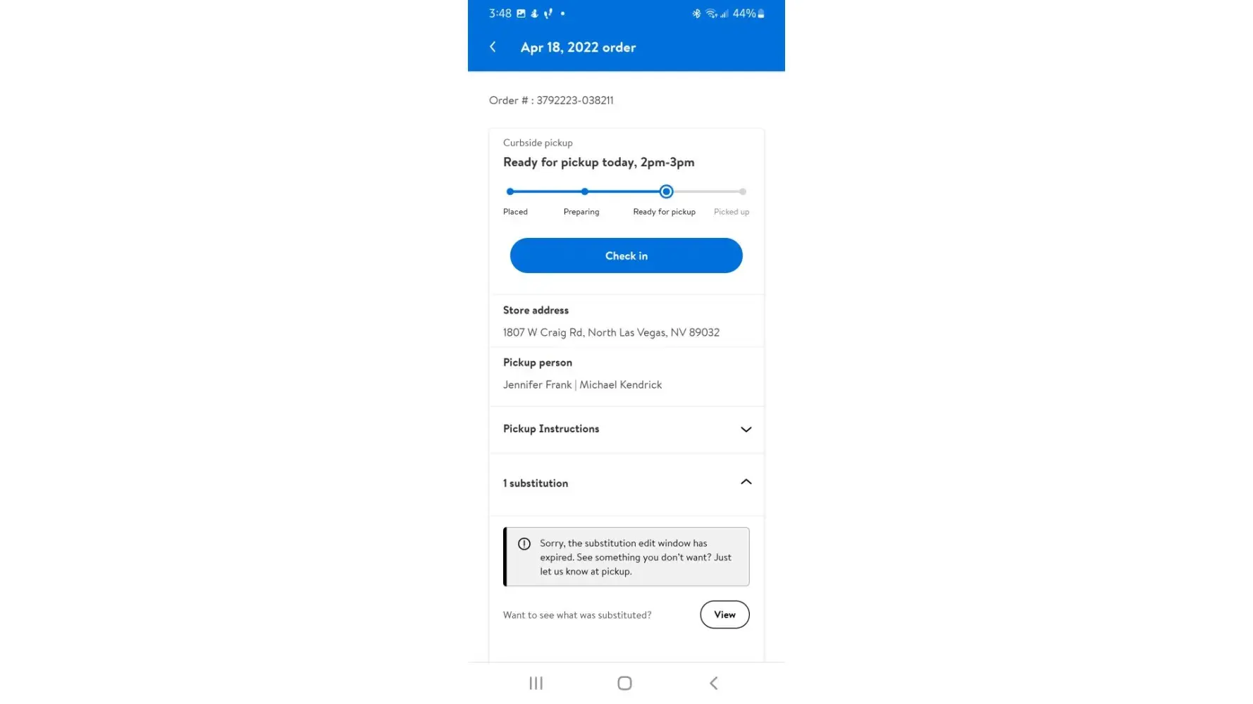 Couldn't checking because the app wants access to your location, and I wasn't told how to contact anyone if there was an issue. My bf drove 20 min. Out of his way, pulled in, sat, decided to walk into the store after being at work, was told "they couldn't help him and to call a number" he called, I called, I called the store, he called again and no one answered. How are we supposed to figure this online pickup crap out if no one at your business gives customer service? One more reason walmart is pushing me to target and smiths.