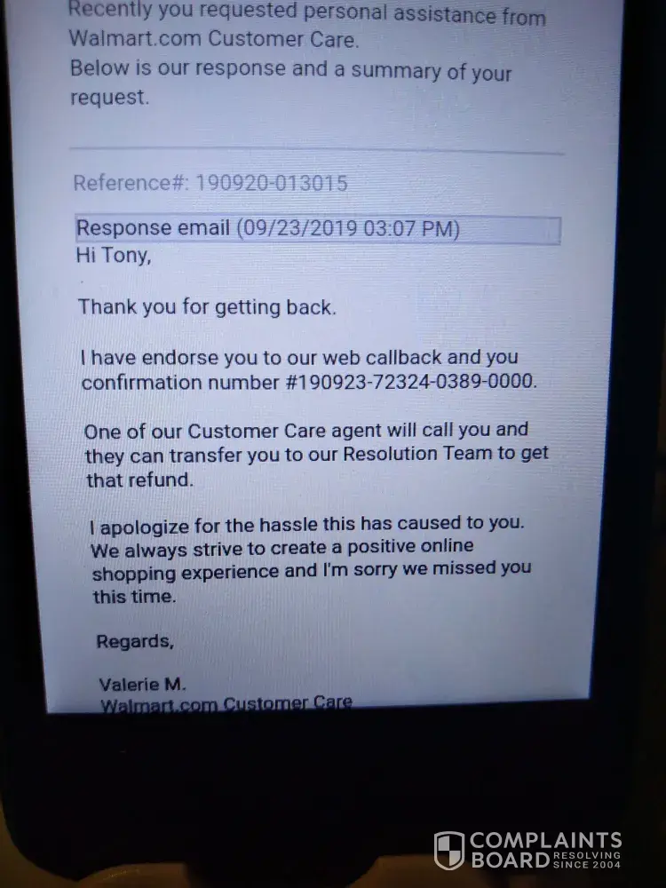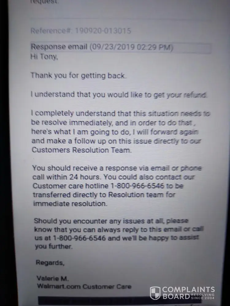 I tried to login a complain ( No. [protected]) and this was done after a lot of effort as I had to repeatedly ask on how to do it, what will be the process, and even get a complaint number. Till now i have not received even a call from walmart which I think is not right