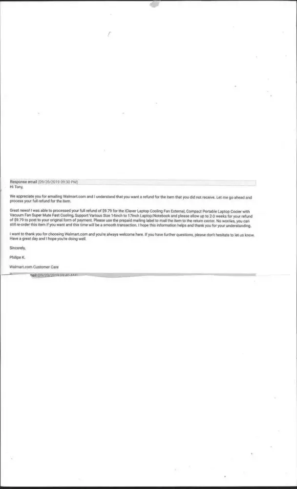 My name is Tony Bobet from New York City. I resided 1710 Seward Avenue, Bronx, New York City 10473. I am filling an complaint to Walmart.com Superstar in North Bergen. I order an item on September 11, 2019. The item is an Laptop Cooling Fan External Compact Portable Laptop cooler with Vacuum Fan. It's cost $9.79. When I received the item. I didn't receive...
