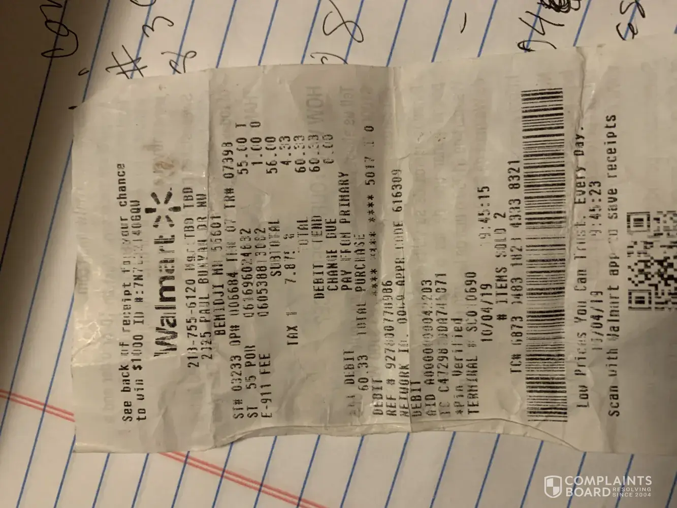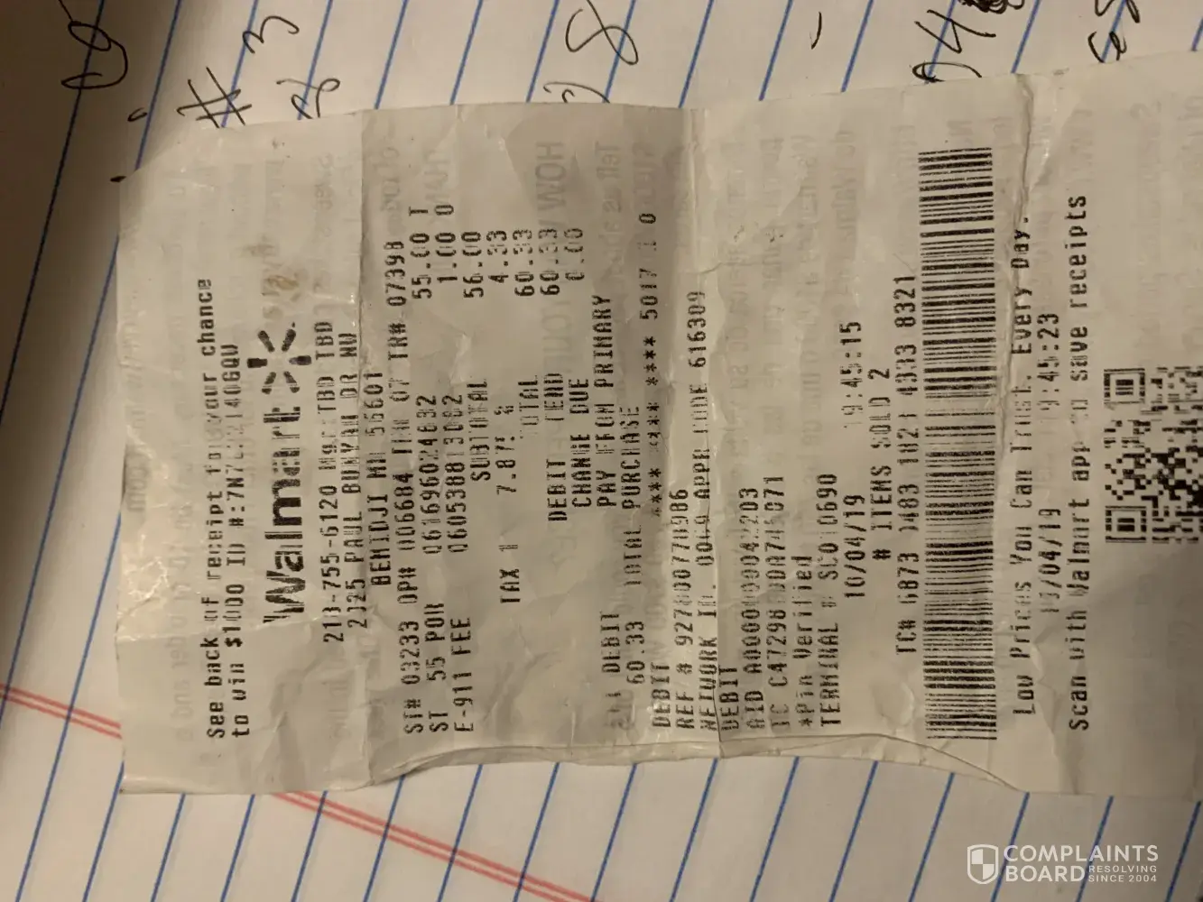 Well this was 9/30/19 time 19:45 my mother paid for a straight talk phone card they said they gave her a service receipt pin. Which we didn't happen to look tell we got home and we live 45 minutes away from the bemidji so she called and lady said oh sorry I know it here so sorry plz bring your receipt in the am. Which we did and once we got there was the...