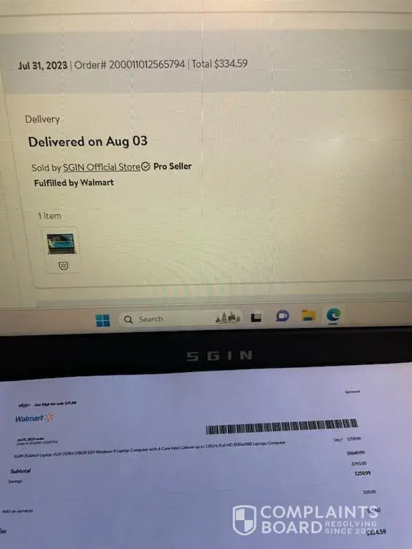 I purchased a SGIN 15’ Laptop computer from Walmart on August 3, 2023. I spent $275.59 plus 59.00 for protection plan insurance, the seller was SGIN OFFICIAL STORE. At the time I assumed that I was purchasing from Walmart. It had a 90 day return which again I thought it was Walmart return policy. I turned the computer on and it disconnected from the...