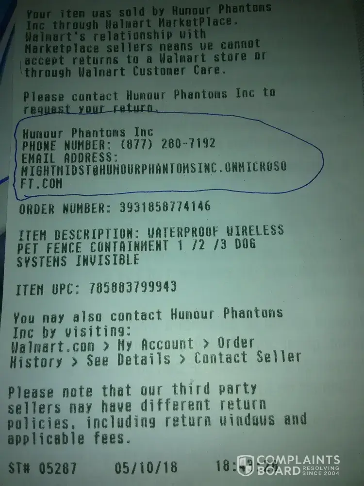 I bought this through Walmart and apparently it came from a third party a company called "Humour Phantoms" I call and they hang up... And Walmart won't refund $ they tell me to go to this bogus company.. This is BS Walmart should be responsible.