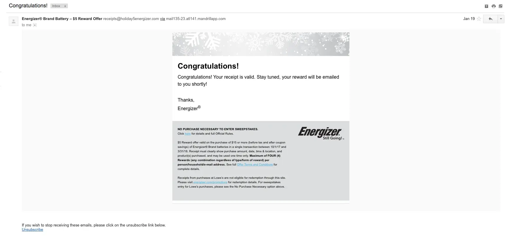 Walmart had a $5 reward offer valid on the purchase of $15 from Energizer®. I was told by email that the reward would arrive shortly. However, it has been more than 2 months, and I have not received any response.
