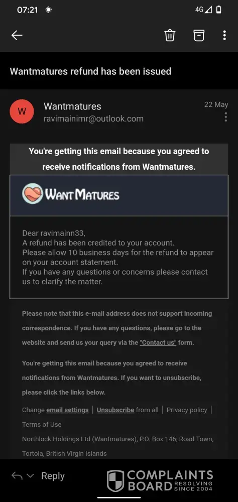 I messaged wantmatures an they agreed that money was taken from my account and after some talking to them they finally agreed to give me my refund saying it may take maximum of ten days .