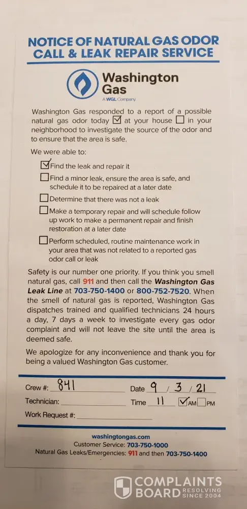 I'm a totally dismayed at how a simple gas leak and service reconnection order went so wrong…I know Washington Gas prides themselves on good customer service, but I'm afraid your company missed the ball on this situation. First, since I have no gas service, and I reiterate that I unable to prepare any meals (gas stove) nor take hot showers (gas water heater) loss time and monies from taking off my job awaiting a reconnection set for all day which is totally unconscionable. Secondly, I spent way too much time on the phone waiting to speak with a Washington Gas representative or supervisor to figure out this debacle.