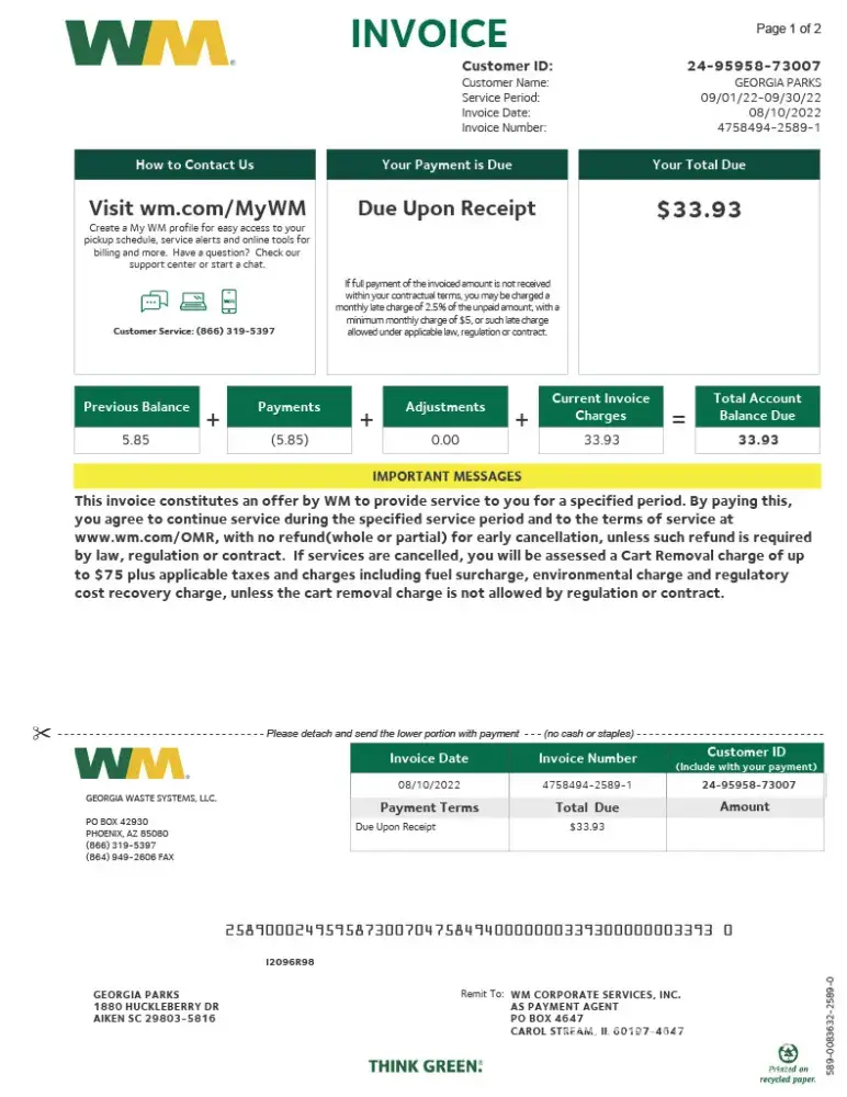 I have emailed WM twice regarding their unethical invoice and have not received a reply. WM is a horrible company!